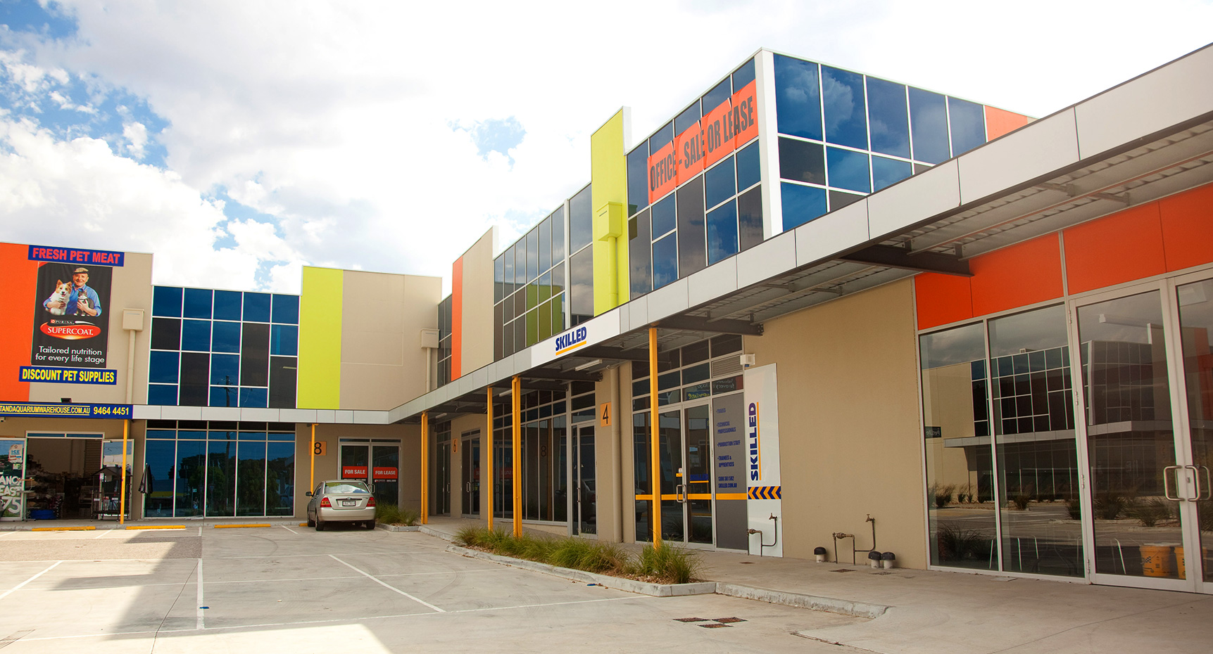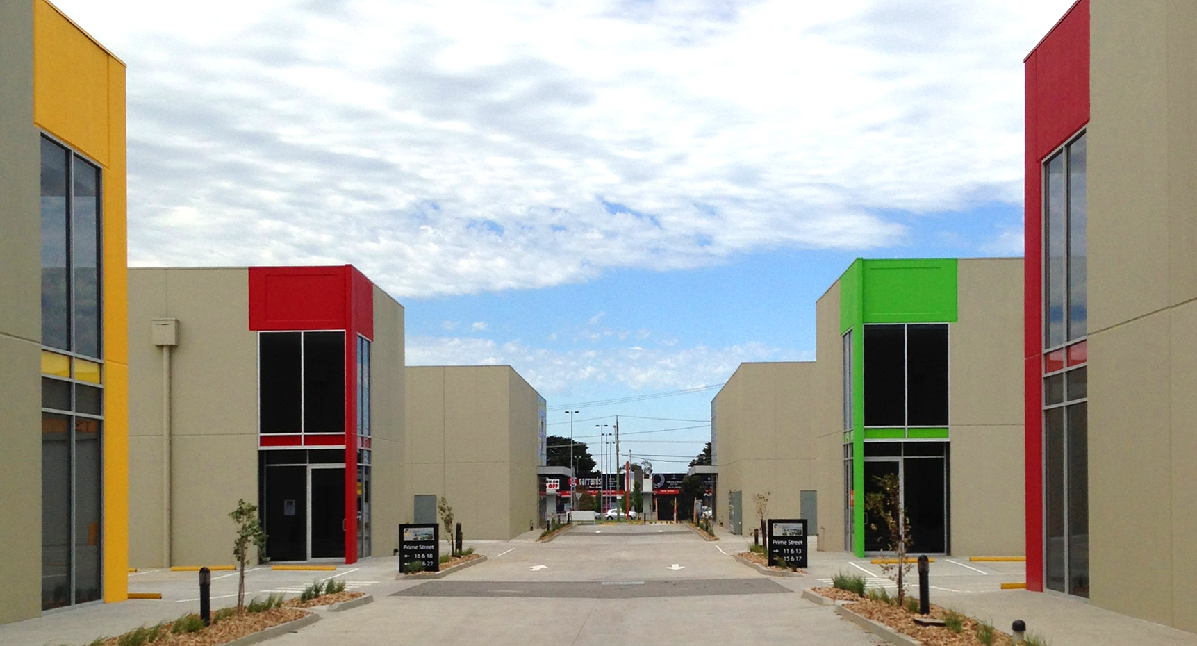 A series of bold colours gives the exteriors of these otherwise highly functional premises a splash of excitement. Landscaped internal streets with wide footpaths have been created to acknowledge the importance of safe movement and the growth in foot traffic.