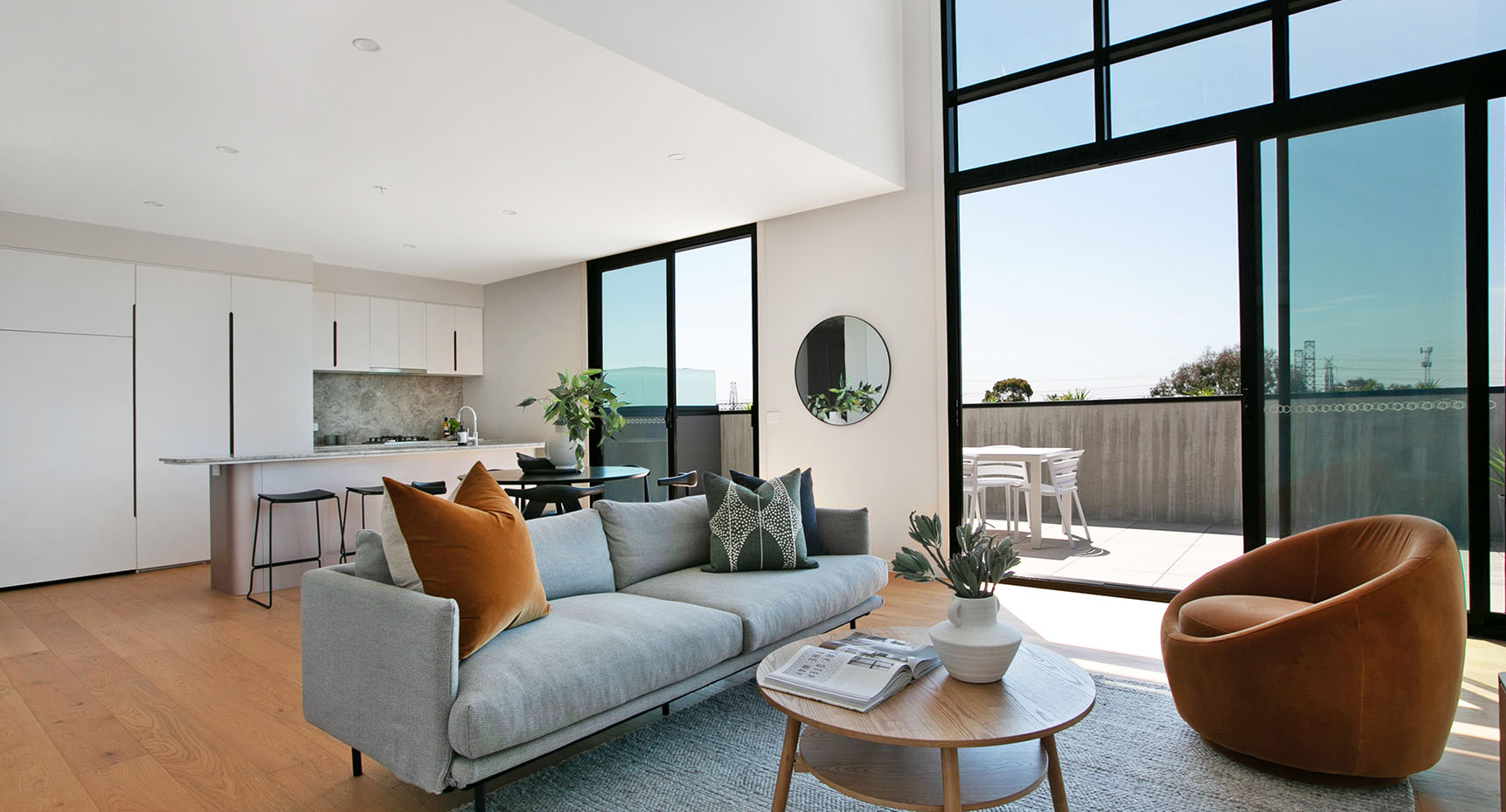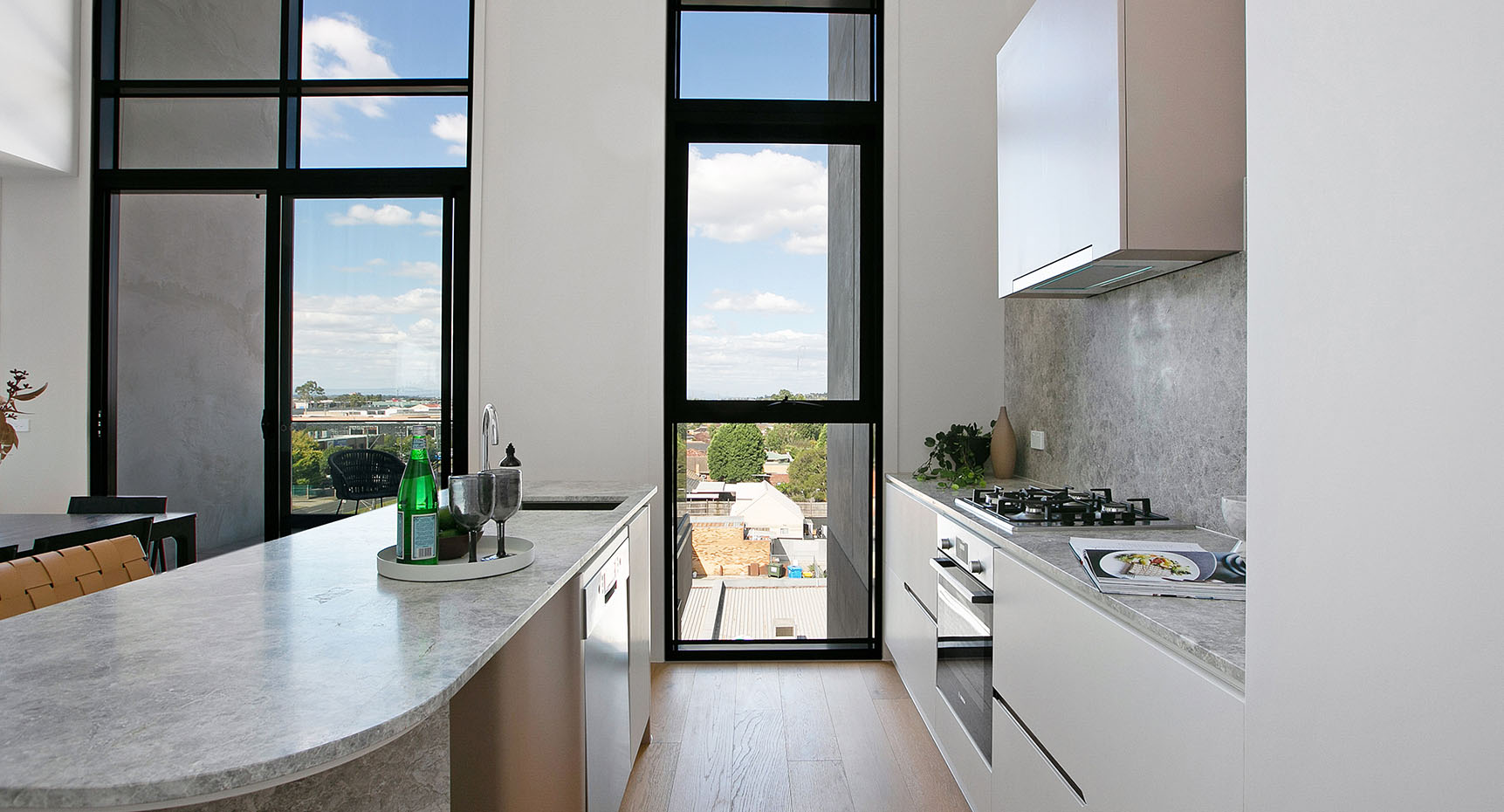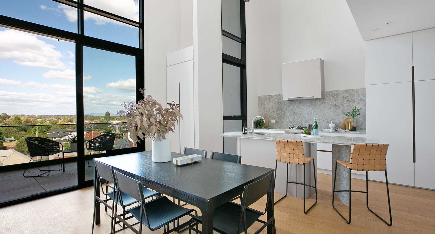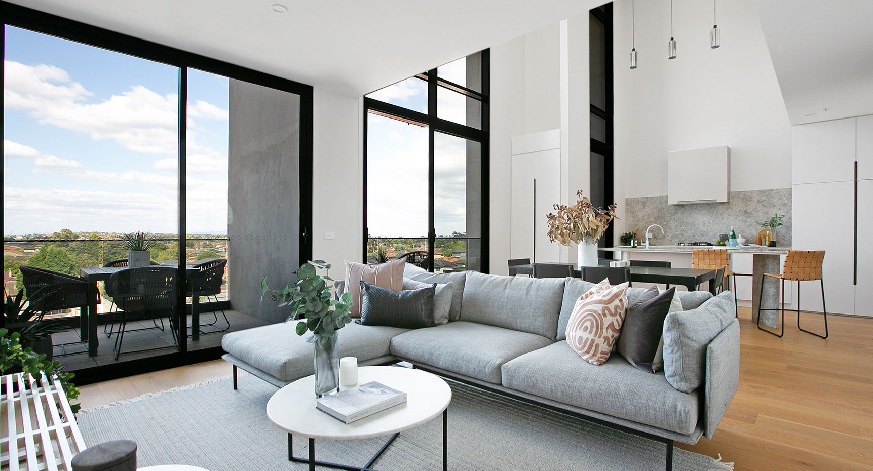 Lounge areas open directly onto spacious balconies at Cappella to provide flexible and interconnected living. The colour and material palettes for these contemporary spaces offset florid whites with elegant timber highlights.