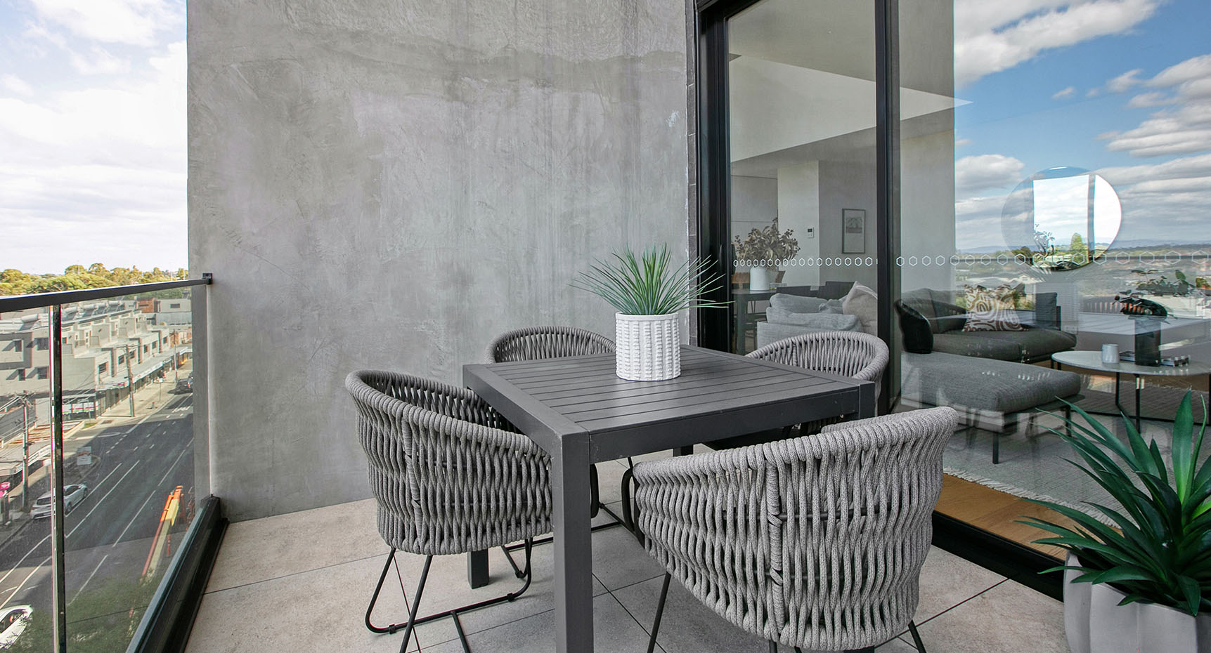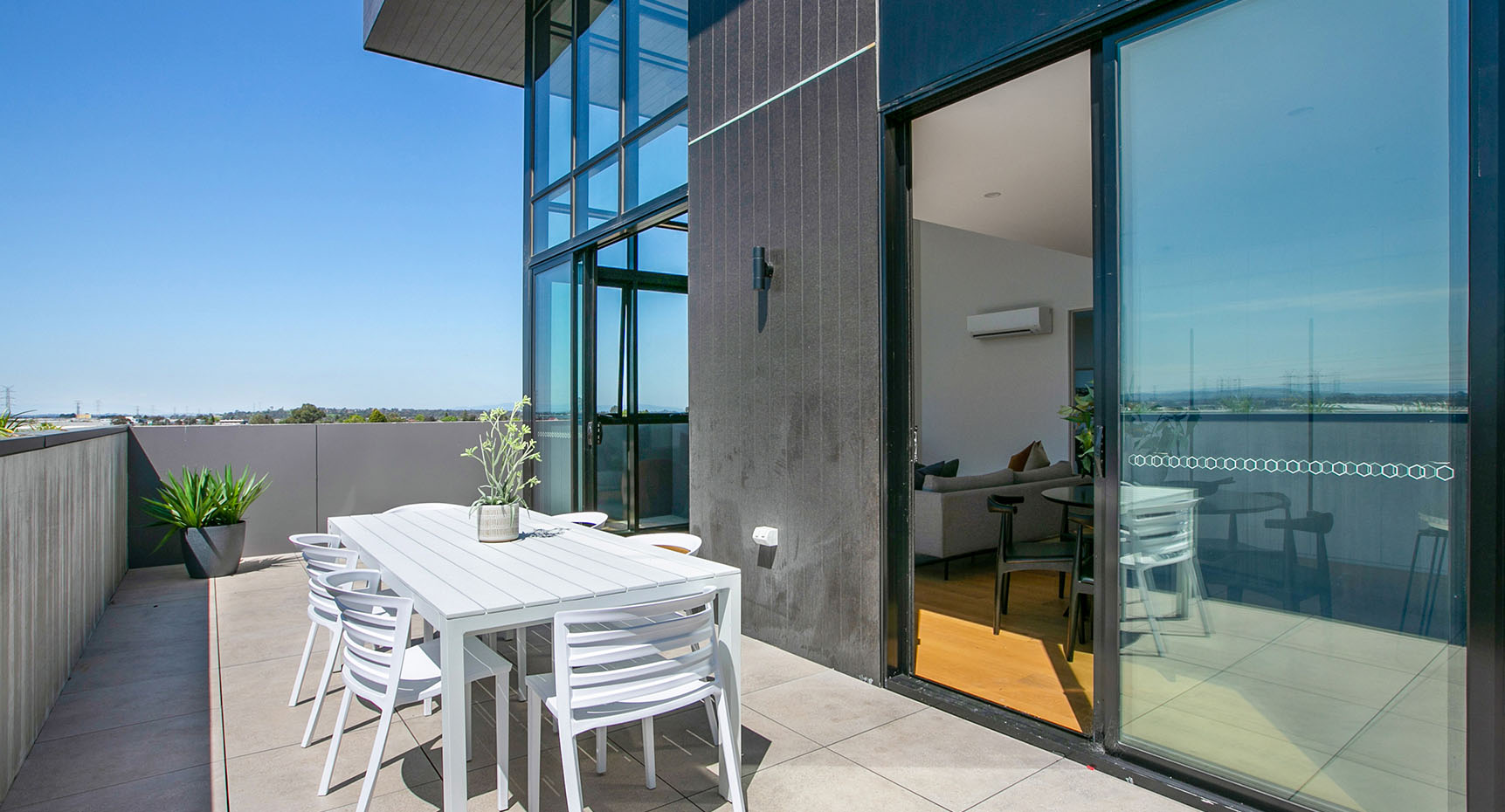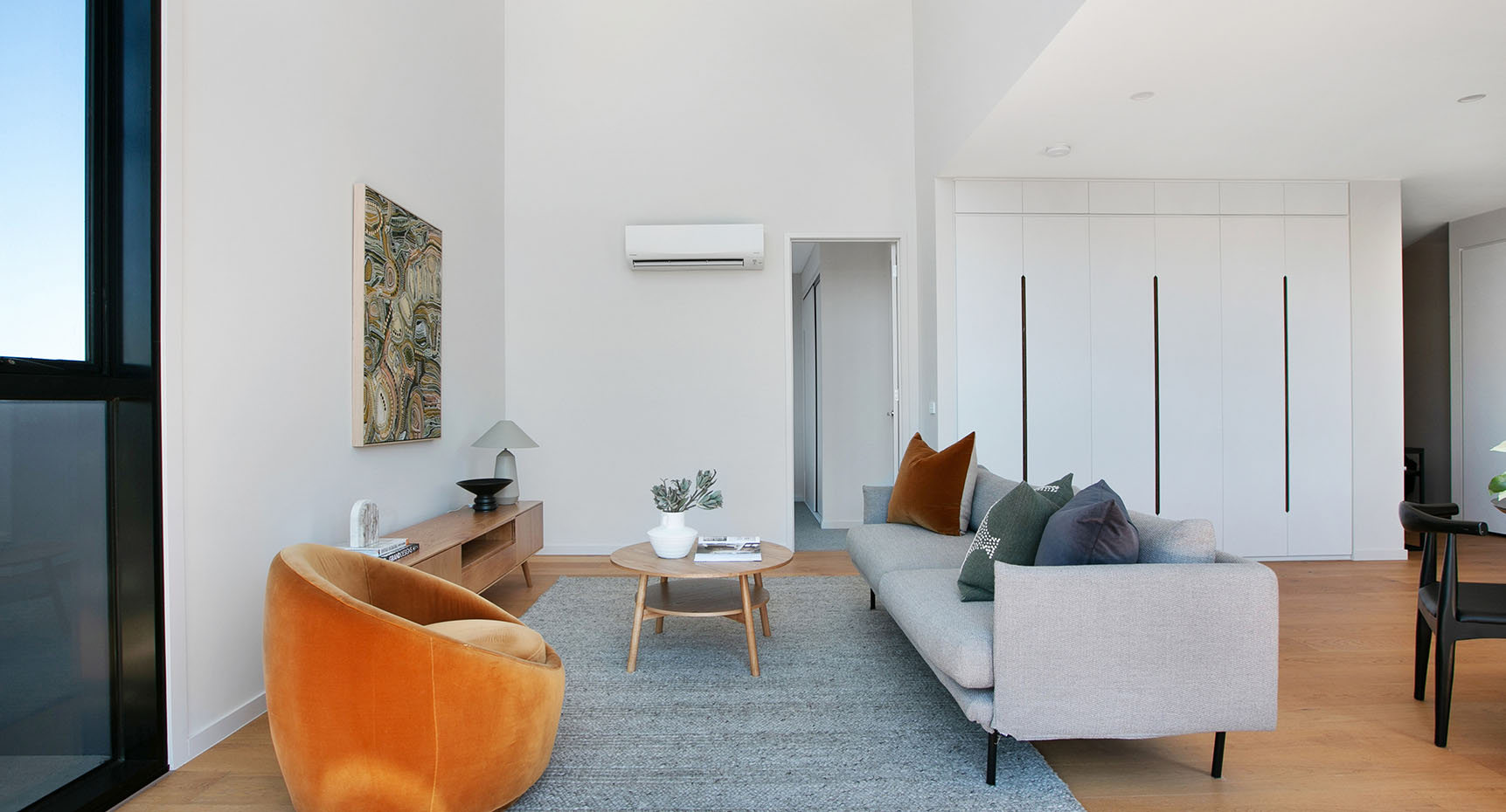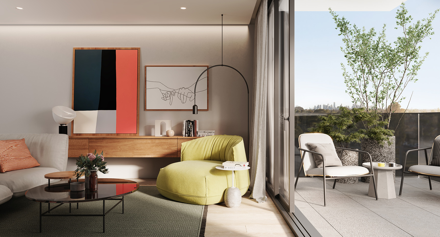 Lounge areas open directly onto spacious balconies at Cappella to provide flexible and interconnected living. The colour and material palettes for these contemporary spaces offset florid whites with elegant timber highlights.