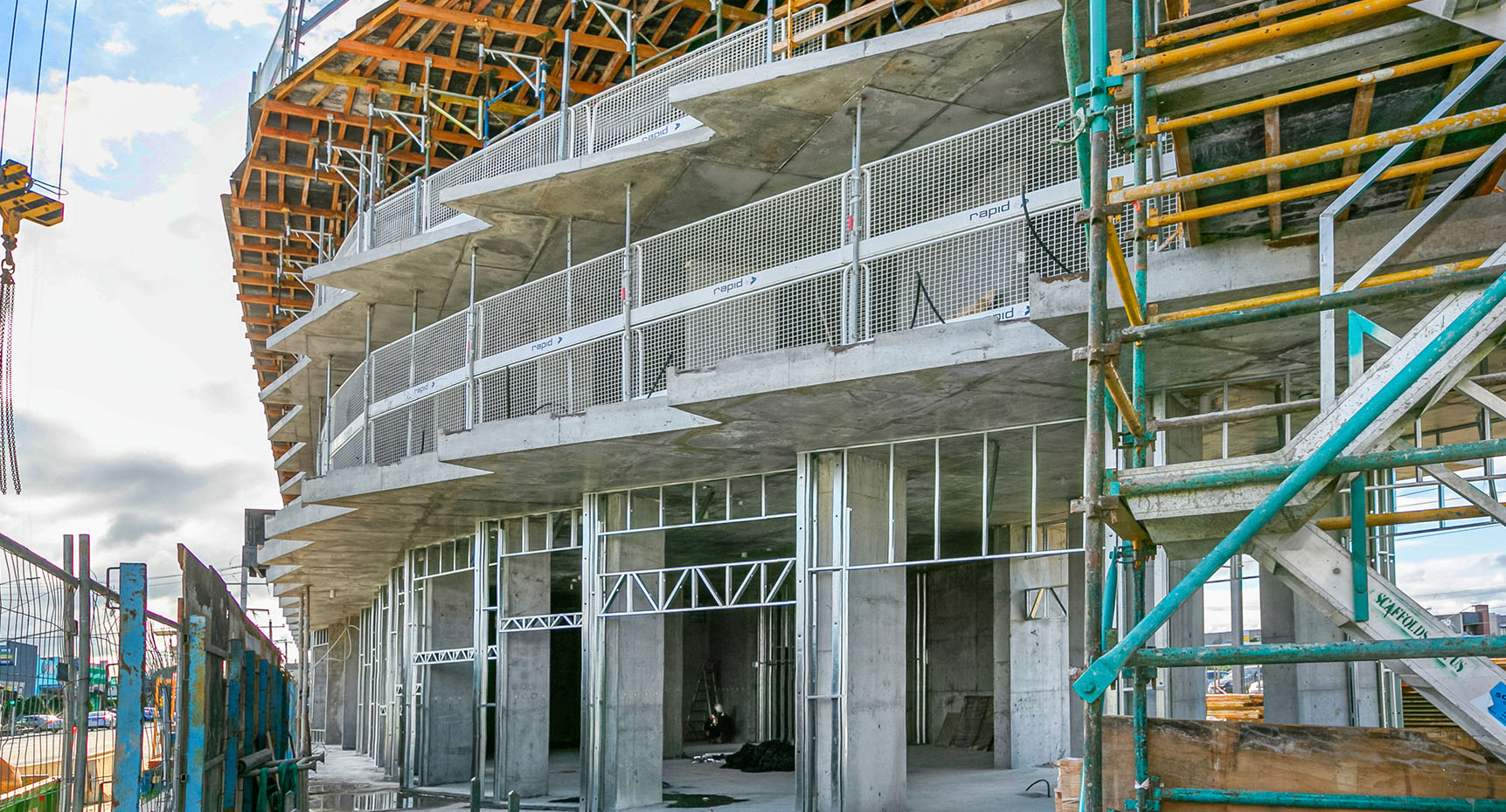The gentle curve between the buildings recalls the familiar image of a train passing around a bend in the track. The ground level façade references the flow of the railway line as the two buildings appear to slip past one another like two trains in the night.