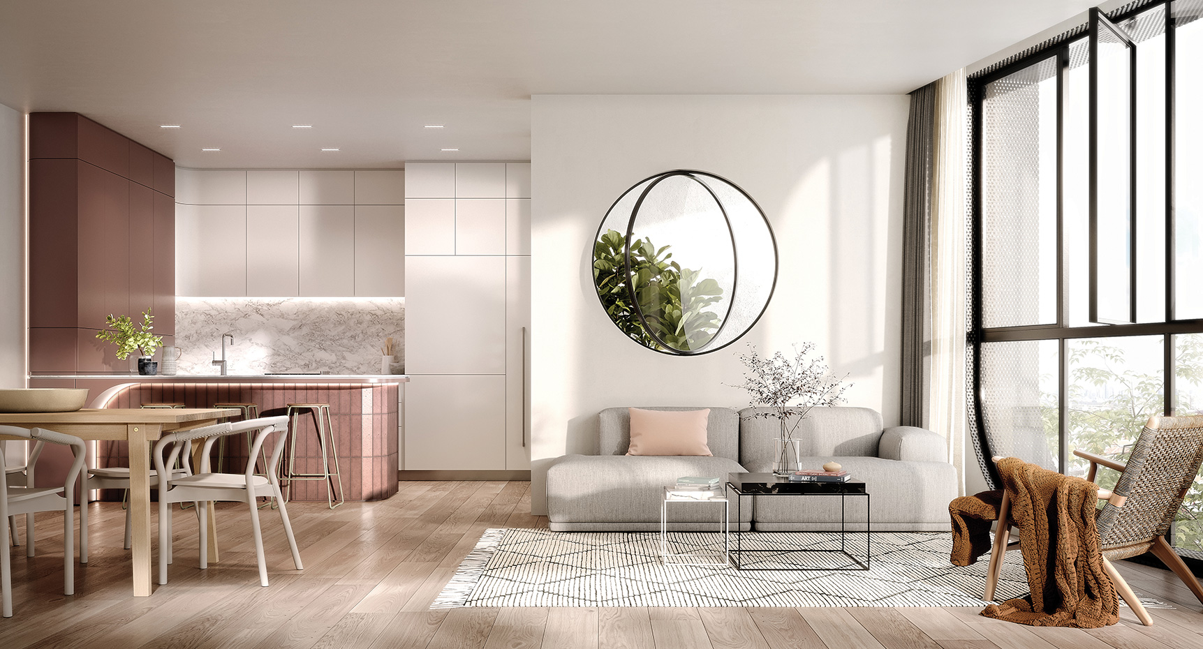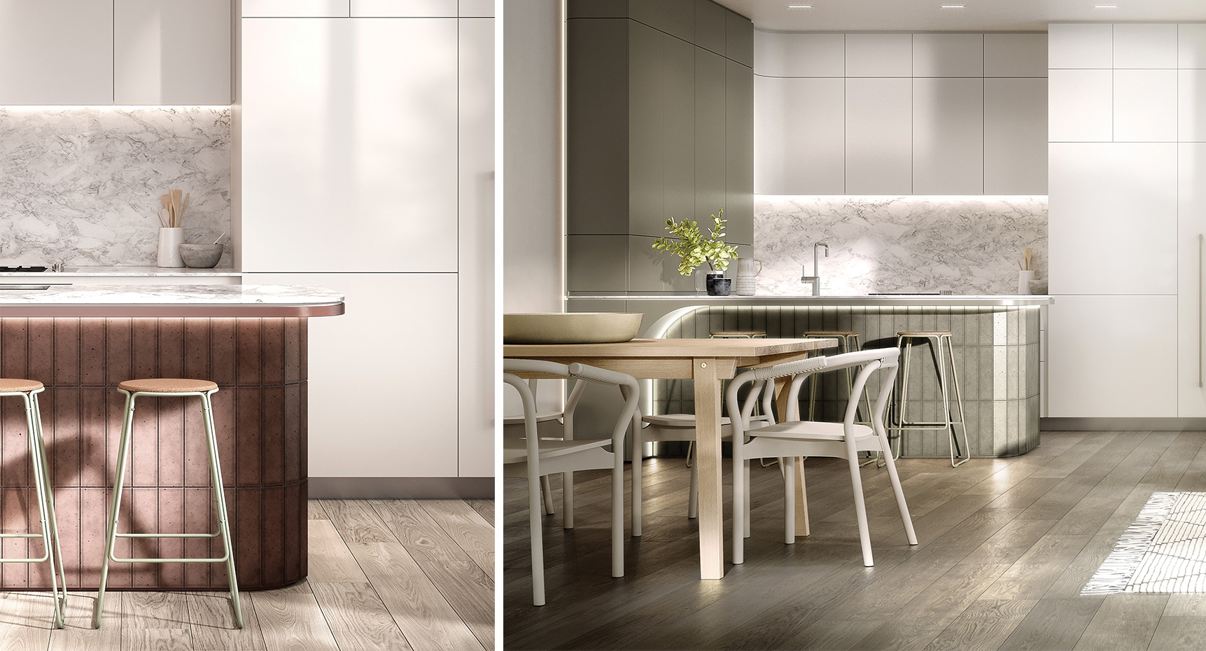 The interiors at Nexus have been thoughtfully designed with soft edges and bold shapes that tie in with the building’s architecture. Rooms are elevated with surfaces that accent a variety of textures, while colours and finishes evoke the familiar materials of the neighbourhood.